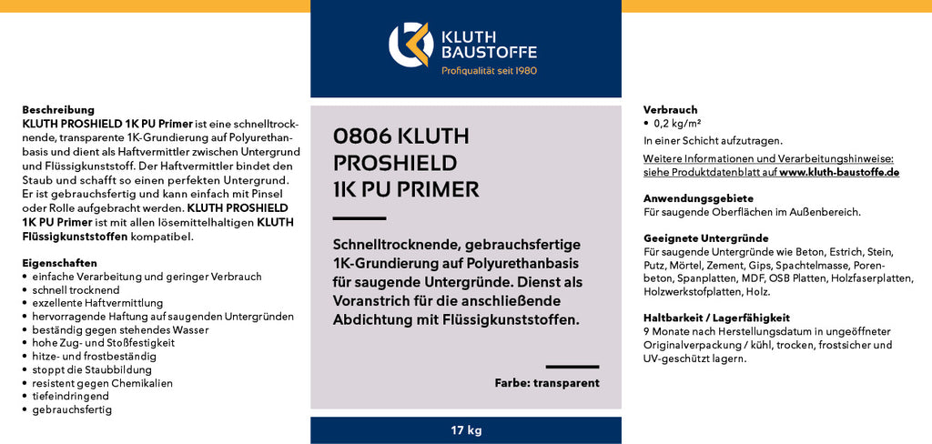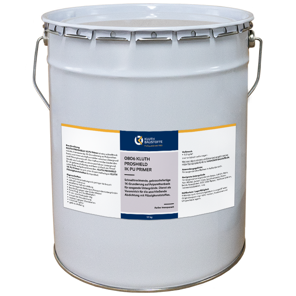 Kluth PROSHIELD 1K PU Primer ist eine schnelltrocknende, einkomponentige und transparente Grundierung auf Polyurethanbasis und dient als Haftvermittler zwischen Untergrund und Flüssigkunststoff. Der Primer ist für saugende Untergründe wie Beton, Estrich, Stein, Putz, Holz, etc. geeignet und besitzt exzellente Haftvermittlung. Der Haftvermittler bindet den Staub und schafft so einen perfekten Untergrund für eine anschließende Abdichtung oder Beschichtung. Die Grundierung ist gebrauchsfertig und kann einfach mit Pinsel oder Rolle aufgebracht werden. Kluth PROSHIELD 1K PU Primer ist kompatibel mit alle KLUTH Polyurathan Abdichtungen und Beschichtungen. Der Primer ist beständig gegen stehendes Wasser, chemikalienbeständig, frost- und hitzebeständig. Bereits nach 1 bis 3 Stunden kann die grundierte Fläche beschichtet werden.