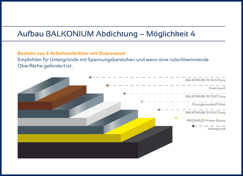 Die innovative DUO-Technologie vereint Abdichtung und Nutzschicht in einem Produkt – für eine schnelle, einfache und langlebige Verarbeitung. Kluth BALKONIUM kann mit oder ohne Vlieseinlage verarbeitet werden. Das einkomponentige Produkt wird direkt aus dem Eimer aufgetragen und härtet zu einer nahtlosen, elastischen und UV- und witterungsbeständigen Oberfläche aus. Das Produkt ist Abdichtung und Nutzschicht in einem Produkt, somit ist das Aufbringen eines Nutzbelags nicht notwendig. Kluth BALKONIUM ist in den Farben hellgrau und silbergrau erhältlich. Das Produkt wird in nur zwei Schichten aufgetragen und ist somit extrem anwenderfreundlich. Kluth BALKONIUM ist für alle freistehenden Balkone, Laubengänge, Terrassen und Loggien geeignet.