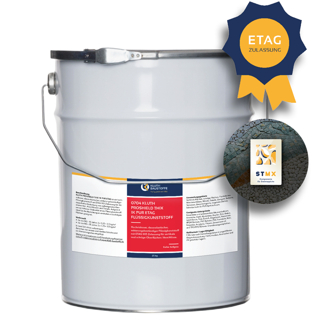 Kluth PROSHIELD THIX 1K PUR ETAG Flüssigabdichtung ist ein hochviskoser / zähflüssiger, gebrauchsfertiger, sehr hochwertiger Flüssigkunststoff für die dauerhafte Abdichtung von Anschlüssen, Details und sonstigen Bauteilen. Aufgrund seiner hohen Viskosität (Zähflüssigkeit) ist er ideal für die Abdichtung von Details, Anschlüssen, aufsteigenden Bauteilen, an vertikalen und schrägen Oberflächen geeignet. Die Abdichtung ist für eine Vielzahl von Untergründen zugelassen. Kluth PROSHIELD THIX 1K PUR ETAG ist geprüft und besitzt die ETAG 005 Zulassung. Der Flüssigkunststoff wird den höchsten Ansprüchen von Handwerksfachbetrieben gerecht, er ist universell einsetzbar, einfach zu verarbeiten und besitzt ein hervorragendes Preis- / Leistungsverhältnis. Des Weiteren ist Kluth PROSHIELD 1K PUR ETAG sofort regenfest, normal begehbar und wurzelfest. Die Abdichtung besitzt die Nutzungsdauer W3: 25 Jahre. Der Dichtstoff lässt sich auch nass-in-nass verarbeiten und kann somit schnell verarbeitet werden, das spart nicht nur Zeit sondern auch bares Geld.